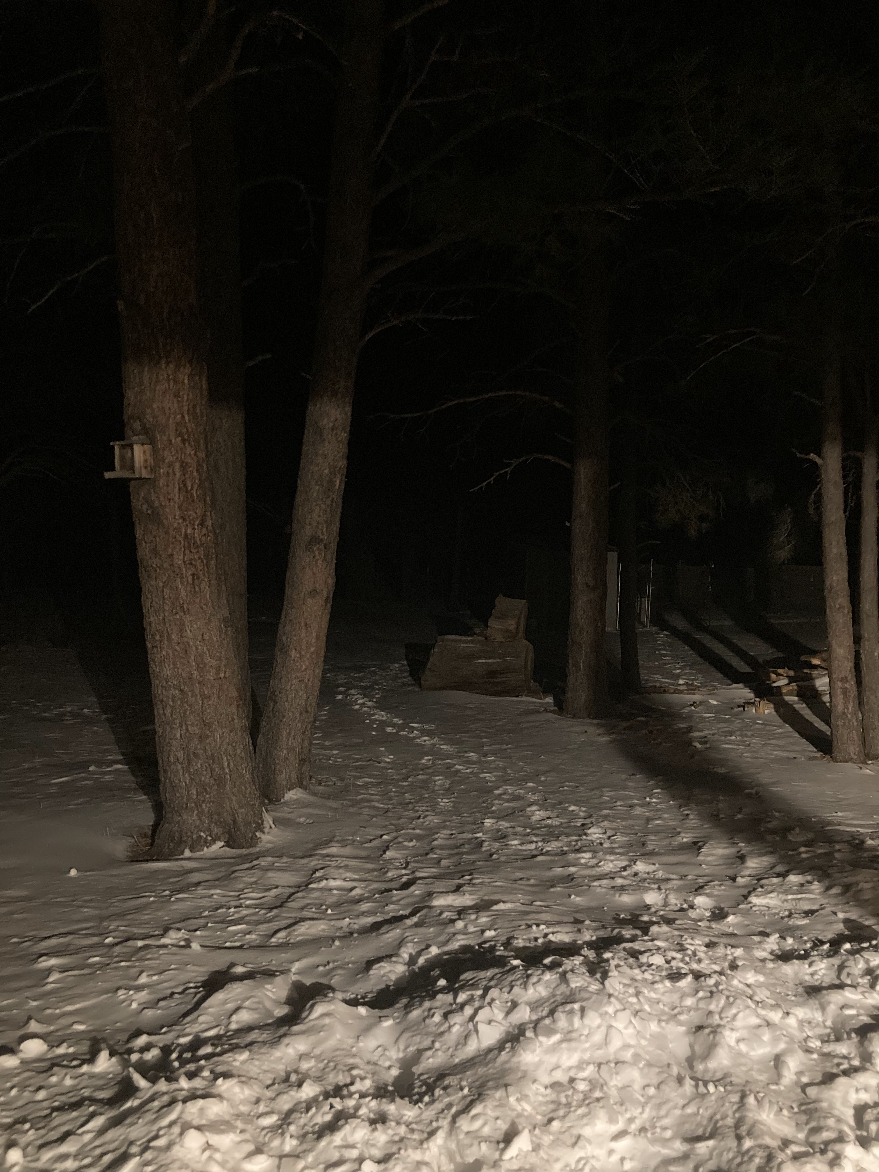 The chickens, all lined up on their perches, cluck softly as I enter. Checking one last time for eggs, I step in briefly. Sometimes Peep, the Americana, will lay an egg is the big bag of extra bedding, so I make sure to shine my flashlight around before I close their little door, step out, close and lock the big door, and head back to the house. After going potty one last time, Dakota comes running up behind me, quickly over-taking me and beats me to the back door of the house. She waits patiently for me to catch up and let her back in.